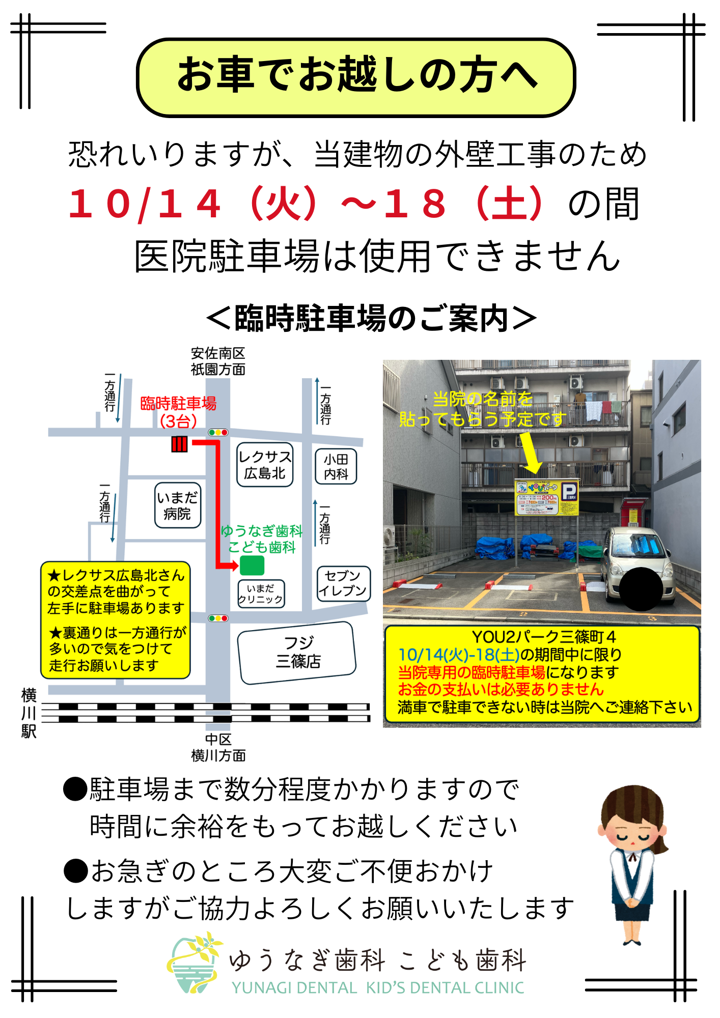 10/14(火)-18(土)の間、当院の駐車場が使用できなくなります。